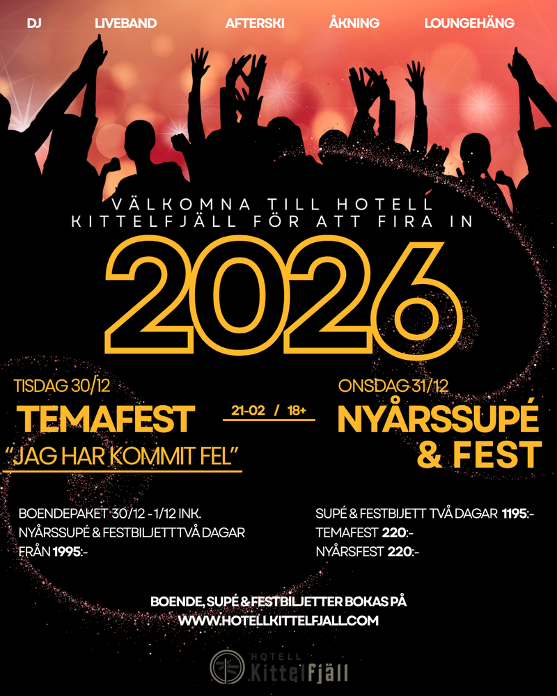 31/12 ställer vi till med stor nyårsfest! After ski med Marcus, Gerhard & Löwe, Nyårssupé i restaurangen och fest där DJ Hanna J skapar magisk stämning på dansgolvet. Vi firar tolvslaget tillsammans och sen fortsätter festen fram till 02.00.